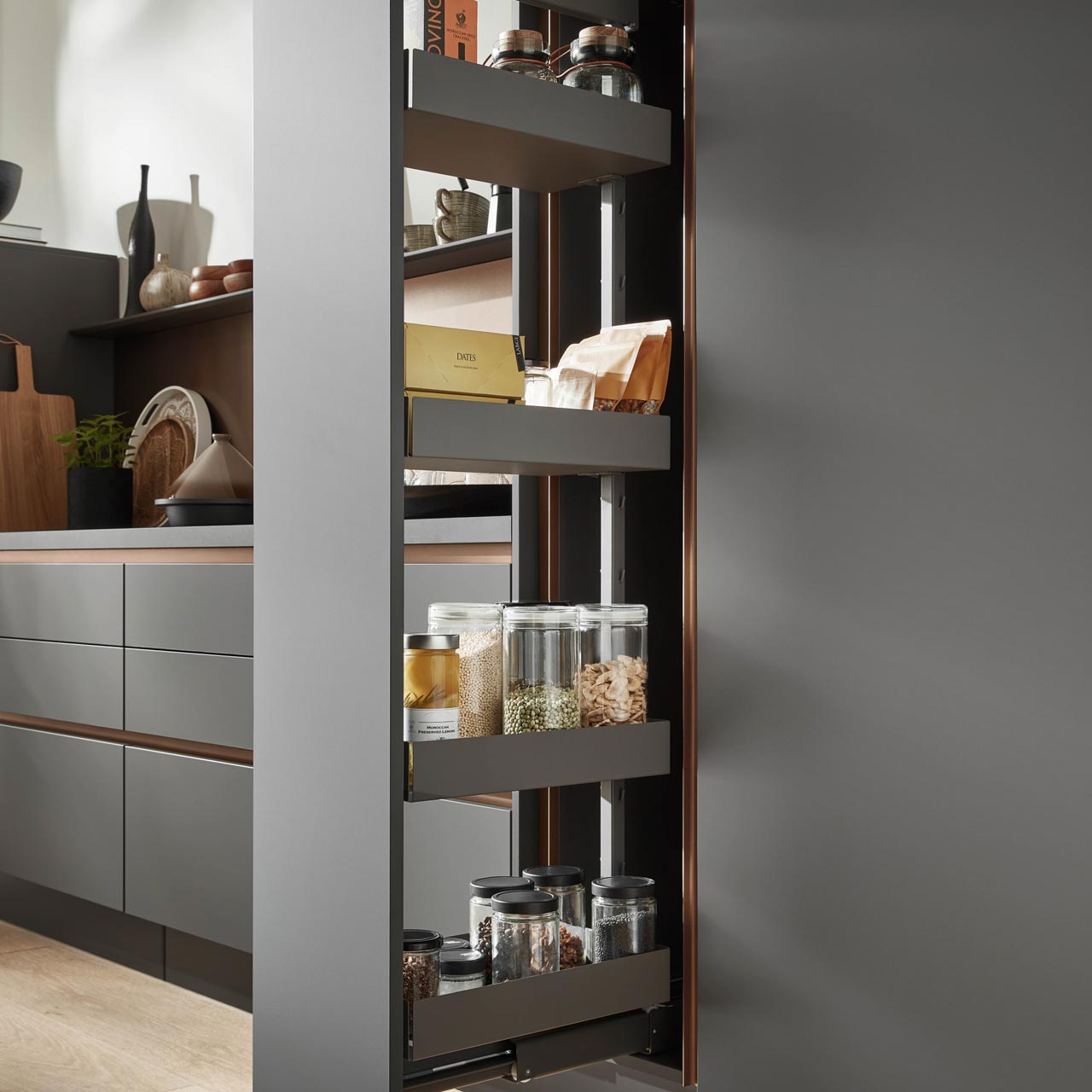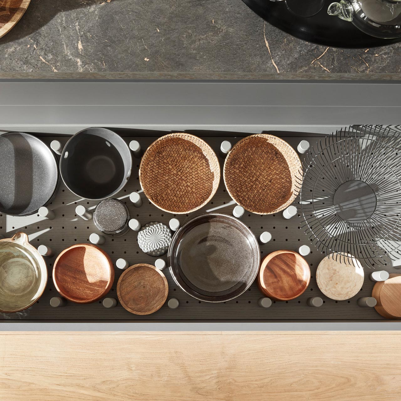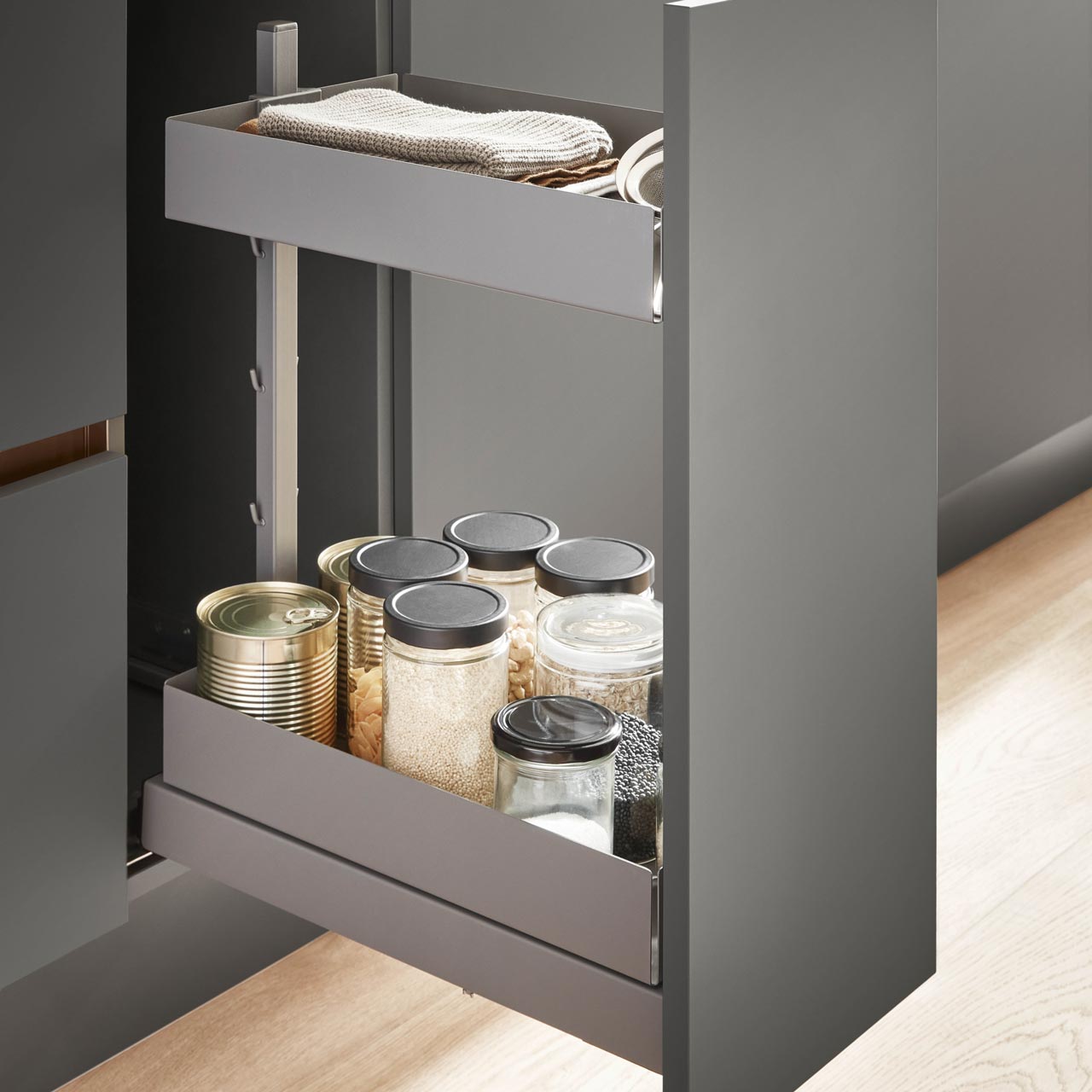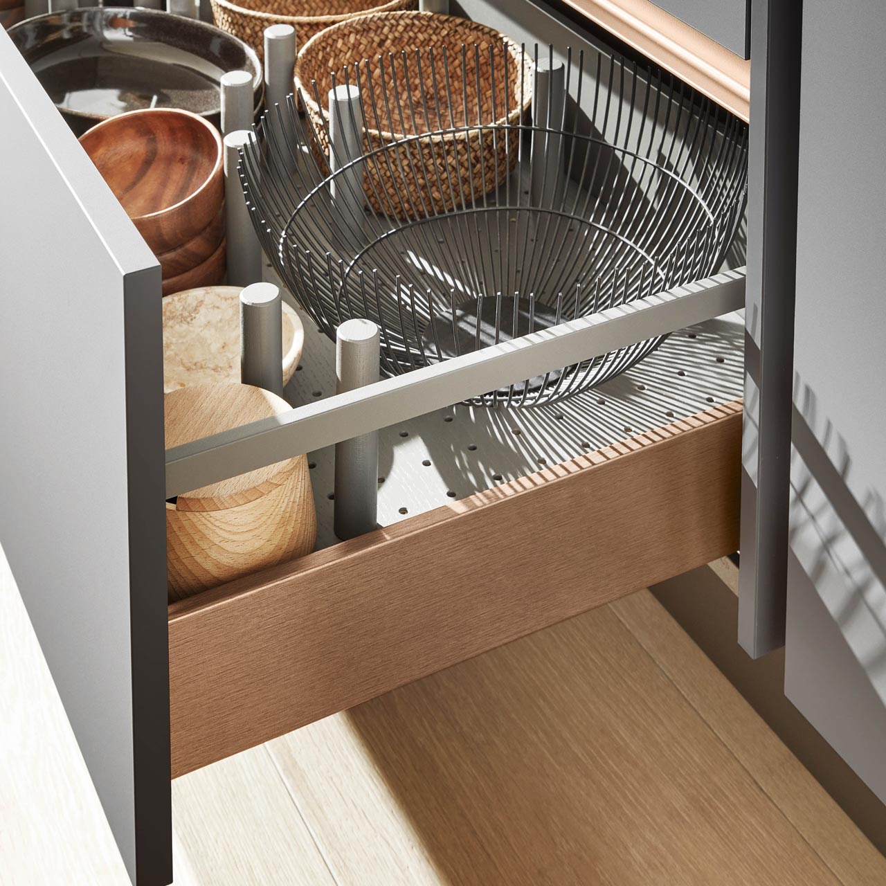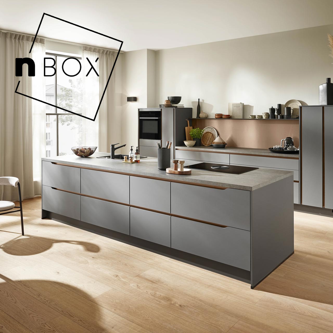 Mit nBOX werden neue Maßstäbe beim Schubkastensystem gesetzt. Als Serienstandard bietet es neben dem Premium-Design, auch mehr Komfort sowie durch Design-Cover und -Profile vielfältige Individuali- sierungsmöglichkeiten. Zusätzlich sorgt die Farbe Schiefergrau für eine elegante Optik des gesamten Interieurs. Die perfekte Lösung für Küche, Bad und Wohnen – ein funktionales System für alle Räume.