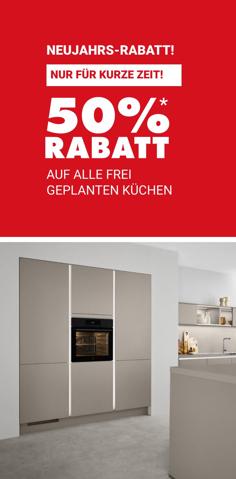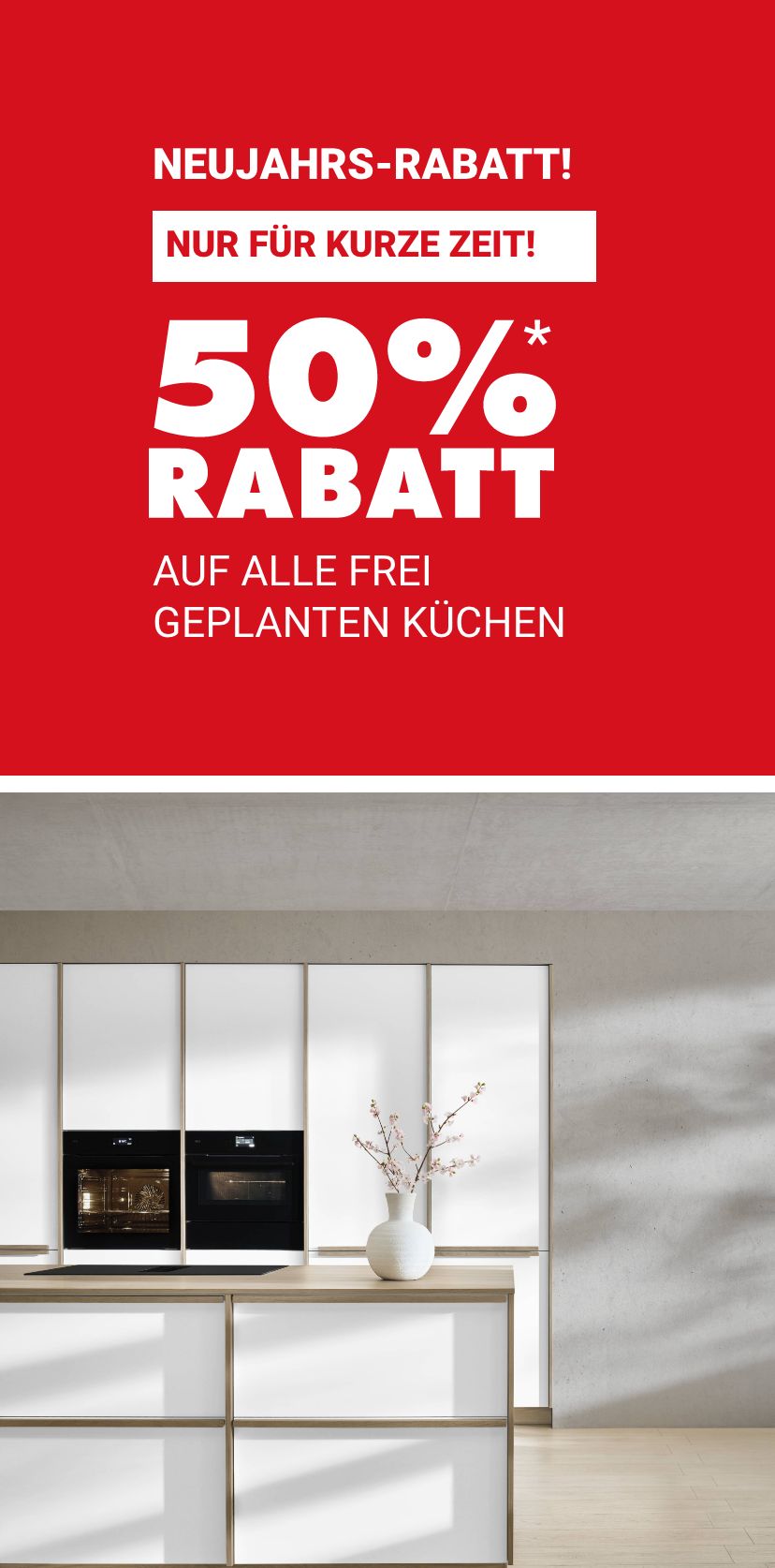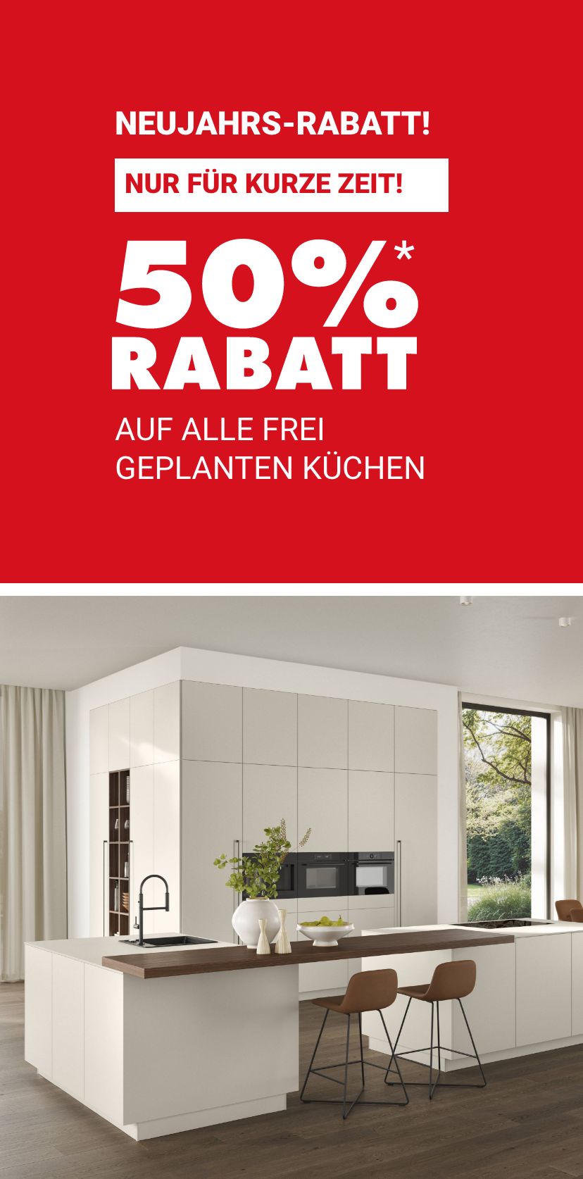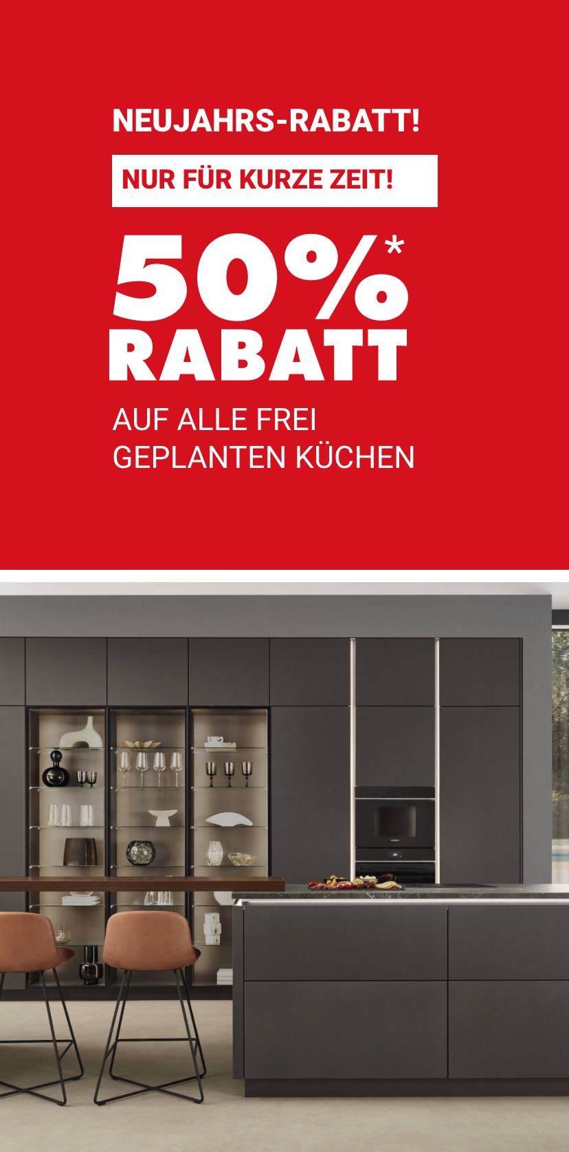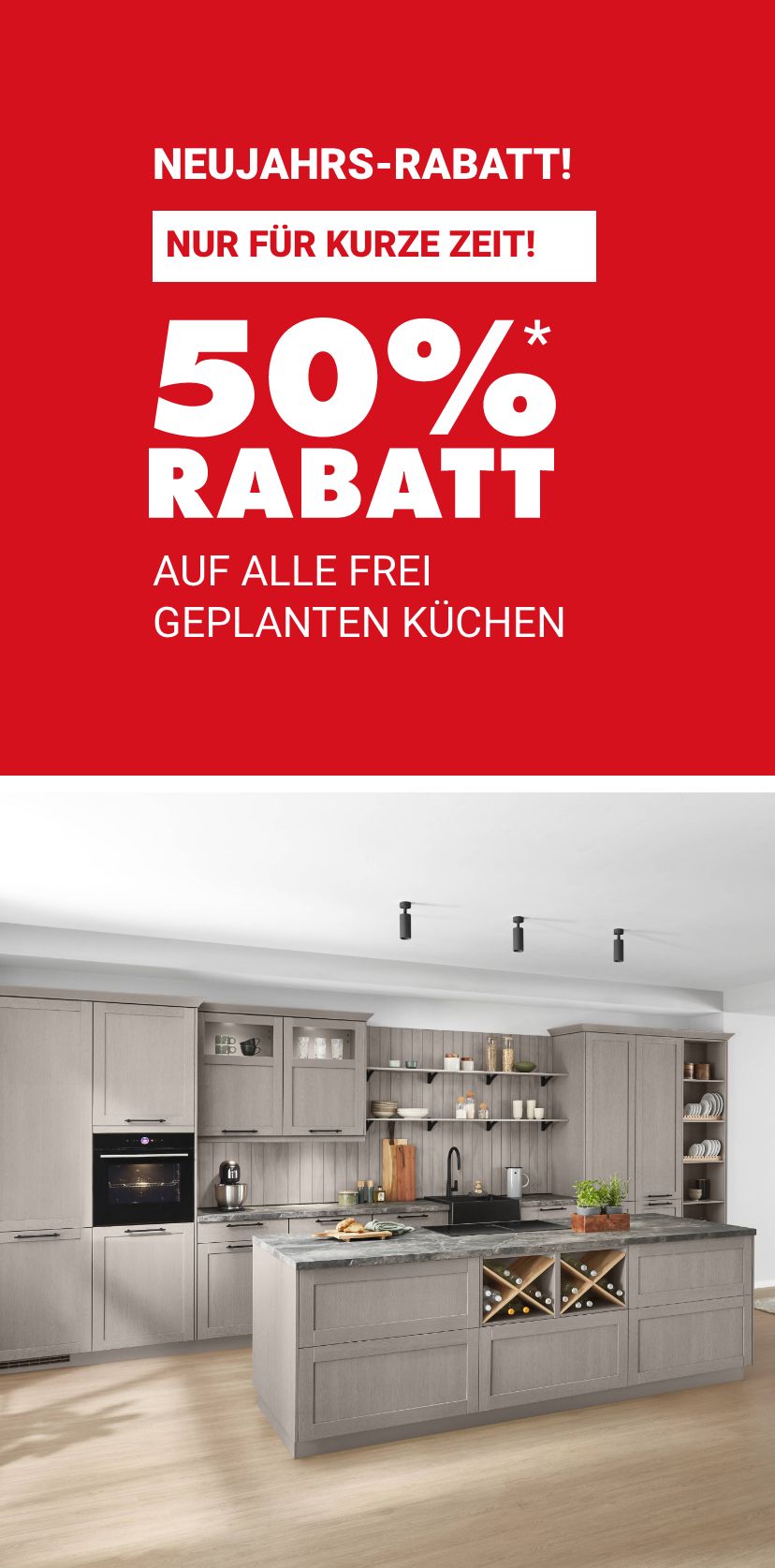 * Gültig nur für Neuaufträge von frei geplanten Küchen. Bei allen in Anzeigen, Mailings und Prospekten angegebenen Preisen sind bereits sämtliche Nachlässe berücksichtigt. Nicht kombinierbar mit anderen Aktionen, keine Barauszahlung möglich.