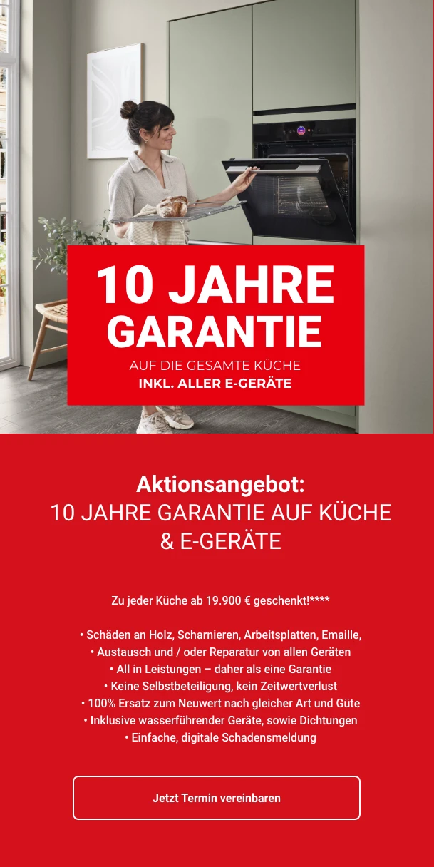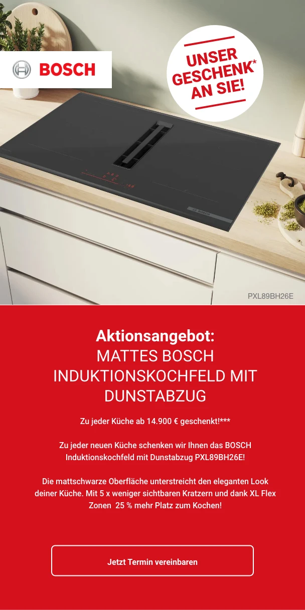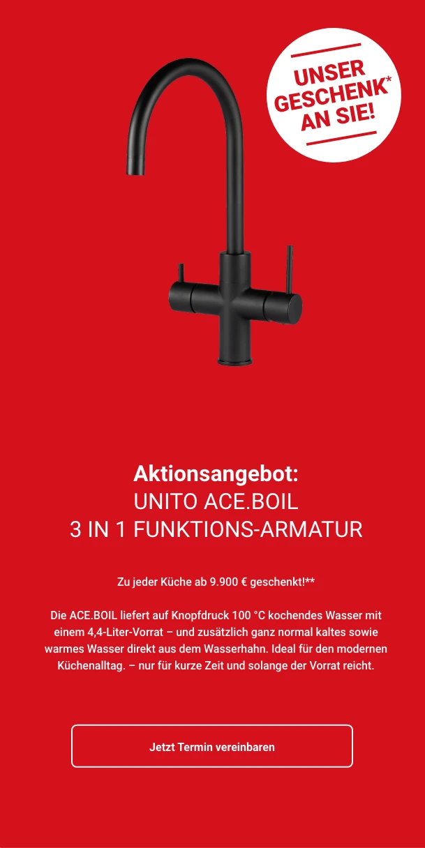 *Gratis ab 4.900 € Auftragswert APPLE IPAD 10.9 WF A16 128GB SLV-ISP **Gratis unito ACE.BOIL 3 in 1. Nur gültig auf frei geplanten Küchen ab einem Auftragswert von 9.900,- €. Gilt nur für Neuaufträge. Nicht kombinierbar mit anderen Aktionen, keine Barauszahlung möglich. Nur solange der Vorrat reicht. ***Gratis Induktionskochfeld mit Muldenlüfter Bosch PXL89BH26E (Umluft). Nur gültig auf frei geplante Küchen ab einem Auftragswert von 14.900,- €. Gilt nur für Neuaufträge. Nicht kombinierbar mit anderen Aktionen, keine Barauszahlung möglich. Nur solange der Vorrat reicht. **** Gratis* 10-Jahres-Garantie auf die gesamte Küche inklusive Elektro-Geräte. Garantiebedingungen vor Ort einsehbar. Nur gültig auf frei geplante Küchen ab einem Auftragswert von 19.900,- €.