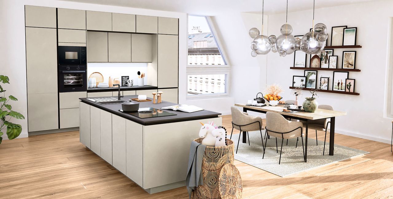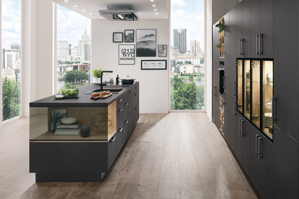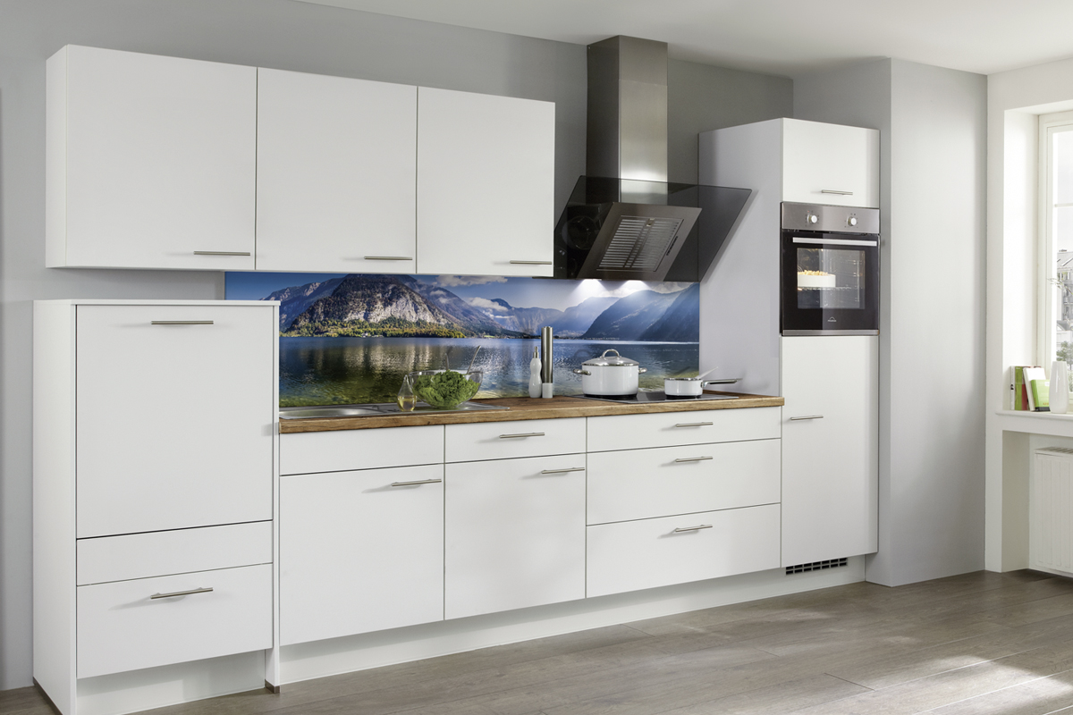 Inklusive Einbaubackofen schwarz Siemens HB234ABB3 Energieeffizienzklasse A+, Glaskeramik Kochfeld mit Induktion und Kochfeldabzug (Umluft) Bora GPNextE80N, Kühlschrank Laurus LKG88E Energieeffizienzklasse E, Mikrowelle Junker JP4119260, Einbau-Designspüle Elleci Logik 300, XL-Schränken, Unterschrank mit Großraumauszügen, Wandschränken mit Klappe.
